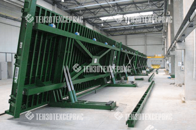 Поворотный стол состоит из двух металлических рам, одна из них является основанием, на которой смонтировано остальное оборудование стенда. Вторая жесткая металлическая рама образует поверхность поворотного стола, на котором происходит формование железобетонного изделия. Она установлена на шарнирных опорах нижней рамы и может поворачиваться при помощи телескопических цилиндров в наклонное положение, облегчающее распалубку. На нижней поверхности поворотной рамы закреплены пневмо или электровибраторы.